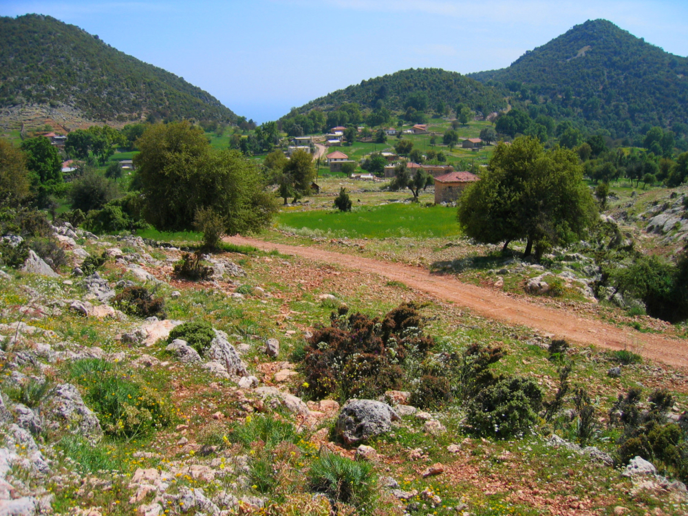 Man verlässt Demre am nördlichen Stadtrand auf der an Myra vorbei nach Osten führenden Asphaltstraße. Bis zur Abzweigung auf den Migrationspfad (Gavur Yolu) nach Belören liegen 5 km monotone Asphaltstraße durch besiedeltes Gebiet. Vielleicht bekommt man eine Fahrgelegenheit dorthin?Unmittelbar hinter der Brücke (N36 15.486 E29 59.323) über den Fluss Demre gabelt sich die Straße. Hier nimmt man die linke Abzweigung und folgt dem Fluss entlang in Richtung der Moschee mit einem blauen Minarettdach. Etwa 300 m hinter Moschee biegt man nach rechts (N36 17.142 E29 58.119) von der Straße ab. Auf Markierungen achten! Man klettert einen gut markierten Pfad den Hang hinauf, passiert Kutluca und trifft kurz vor Belören wieder auf die Straße, auf der man nach rechts in das kleine Dorf gelangt.An der Kreuzung in Belören läuft man rechts bis zu den letzten Häusern und verlässt dann die Ortschaft über eine ansteigende Staubstraße. Wenig später kehrt man der Straße den Rücken und nimmt rechts abbiegend eine Abkürzung. Weiter oben trifft man wieder auf die Staubstraße.Der von Kate Clow als malerisch beschriebene Ort Zeytin besteht eigentlich nur aus ein paar verfallenen Häusern. Man kann auf der Forststraße bleibend das Tal und die Häuser in einem Rechtsbogen umrunden. Der originäre Weg aber kürzt die Straße über einen rechts ins Tal absteigenden Pfad ab. Vor(!) dem Haus mit dem roten Steindach orientiert man sich rechts, steigt den Hang hinauf durch einen Kiefernwald und trifft wieder auf die Straße. Hier biegt man rechts ein.Nach etwa 200 m geht es rechts einen kleinen Pfad den Hang hinunter nach Alakilise (N36 19.772 E30 00.122, 850 m), den Ruinen einer byzantinischen Kirche. Zwischen den verfallenen Mauern findet man gute Zeltbedingungen. Nebenan liegt eine Zisterne mit frischem Wasser. Ein optimaler Ausgangspunkt für den morgigen Anstieg zum Kamm des Karilöz Tepse.