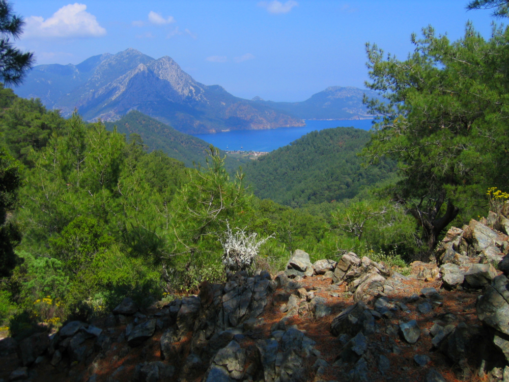 Die Etappe von Karaöz bis zum Leuchtturm verläuft überwiegend auf einer etwas monotonen Forststraße entlang der Küste. Die Abschnitte abseits der Straße kann sich schenken. Sie sind schlecht bis gar nicht markiert, schwer zu finden und verlaufen zumeist nur ein kurzes Stück querfeldein. Die Abzweigung von der Forststraße links hinauf zum Leuchtturm und weiter nach Adrasan ist per Schild gut markiert.In der näheren Umgebung des Leuchtturms (220 m) gibt es wunderbare Zeltplätze. In der Zisterne am Turm findet man frisches Wasser. Für mich ist dies einer der schönsten Orte des gesamten lykischen Pfades. Leider wurde im Jahr 2008 ein Windrad hingebaut, was das Landschaftsbild nicht gerade verschönert. Man hat eine wunderbare Aussicht hinunter zu den der Küste vorgelagerten Inseln. Die über den Bergen untergehende Sonne verleiht dem Ort in der Abenddämmerung eine geradezu mystische Stimmung.Man sollte sich hier gut mit Wasser versorgen. Die nächste Gelegenheit gibt es erst wieder kurz vor Adrasan an der ehemaligen Camel-Farm.Hinter dem Leuchtturm verlieren sich Pfad und Markierungen im Gestrüpp der dichten Macchia. Man orientiert sich am besten an den Steinmännchen und den spärlichen Markierungen. Doch aufgepasst: schnell ist man zu weit aufgestiegen. Insbesondere, da der in der Karte eingezeichnete Wegverlauf nicht ganz korrekt ist. Hinter dem Leuchtturm führt der Weg nicht auf den Markiz Tepe ( 507m). Es geht zwar den Hang schräg aufwärts, doch bleibt der Pfad unterhalb des Gipfels. Er erreicht bei etwa 420 m seinen höchsten Punkt und führt dann wieder abwärts.Bei einigen verfallenen Hütten (es stehen nur noch Reste der Grundmauern) hält man sich halb rechts. Der Weg führt zunächst sanft bergab, alsbald folgt ein steiler Abstieg in ein Flusstal. Mit Wasser ist hier aber nicht zu rechnen.Die in beiden Führern erwähnte Abzweigung rechts hinunter zum Meer habe ich bislang nicht entdeckt. Der weitere Wegverlauf ist gut markiert. Hinter dem Flusstal geht es nach kurzer Zeit durch einen Kiefernwald wieder stetig bergauf. Ein Geröllfeld querend erreicht man wenig später einen Sattel bei 300 m. Rechts liegt ein schöner Aussichtspunkt auf einer roten Felsspitze. Wenig später steht man bei 380 m auf einem weiteren Sattel.Ab jetzt geht es bis Adrasan nur noch bergab. Die Markierung ist ausgezeichnet. Die ehemalige Camel Farm (Ruined House) liegt wie eine Geisterstadt zwischen den Kiefern. In ein Betonbecken sprudelt frisches Wasser.