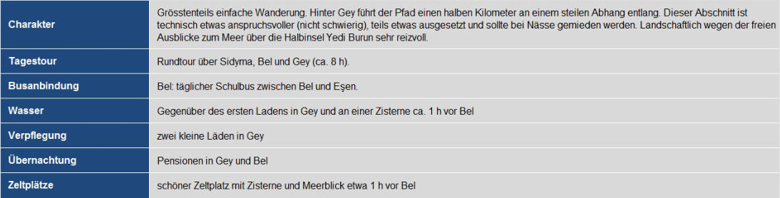 nach links und folgt den Markierungen nach Gey (N36 25.060 E29 08.743). Gleich am Ortseingang befindet sich ein Lebensmittelladen. Der zweite Laden